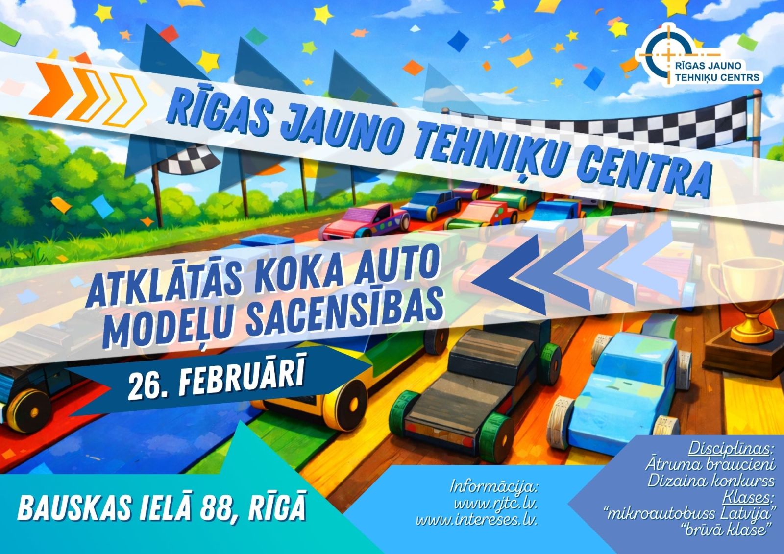 2026. gada 26. februārī plkst.14.00 Rīgas Jauno tehniķu centrā, Bauskas ielā 88 notiks atklātās koka inerces auto modeļu sacensības, kurās aicināti piedalīties bērni un jaunieši līdz 16 gadu vecumam.