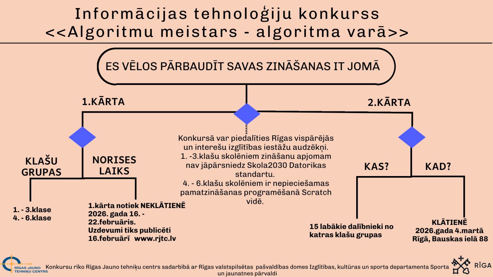- 2.kārta notiek klātienē Bauskas ielā 88, Rīgā, 2026. gada 4. martā. Šajā kārtā piedalās 1. kārtas katras klašu grupas 15 dalībnieki, kuri ir uzrādījuši labākos rezultātus. Dalībnieki piedalās zināšanu pārbaudē, kā arī veic radošus, tehniskus un programmēšanas (Scratch 4. – 6. klašu grupa) uzdevumus ierobežotā laika periodā.